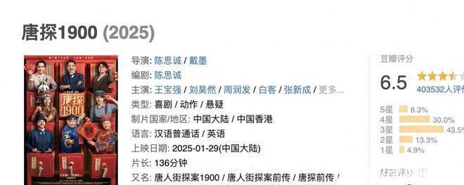 剩下的电影中,《封神》《射雕》口碑票房扑街,《蛟龙行径》无奈撤档,但是《唐探1900》算是稳住了最终的票房。