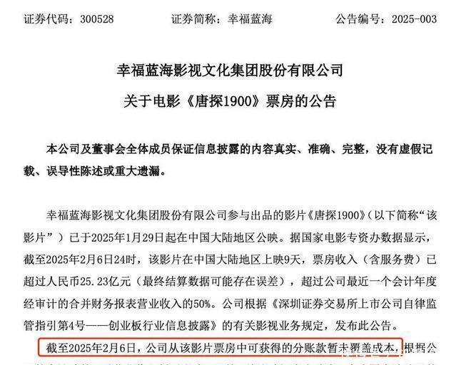 凭据幸福蓝海的票房公告,该片在成绩了25亿票房的技术,皆莫得统统袒护资本。