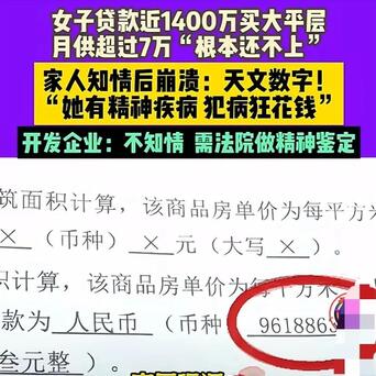 河南郑州,女子月薪4000元,0首付、贷款1400万元买了2套豪宅,每个月月供7万多2024欧洲杯官网入口,还了几个月后,发现根柢还不上,向家东谈主求援。女母子亲得知后崩溃了,“没见过这么的天文数字!她有精神疾病,一犯病就狂用钱!”
