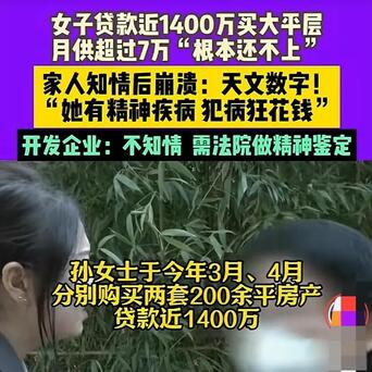 据悉,女子小孙月薪4000元,前不久,0首付、贷款1400万元买了2套豪宅,每个月月供7万多,还了几个月后,小孙发现以我方的经济实力,根柢还不上,于是向家东谈主求援。