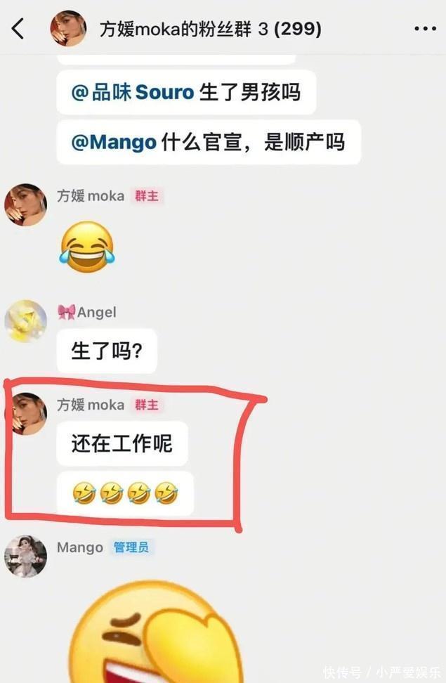 网上一度流出方媛粉丝群的聊天截图,9月30日晚有东说念主问“生了吗”,她回了句“还在职责”,背面跟了几个哭笑的情态