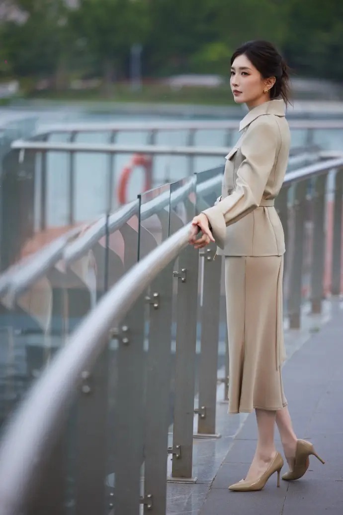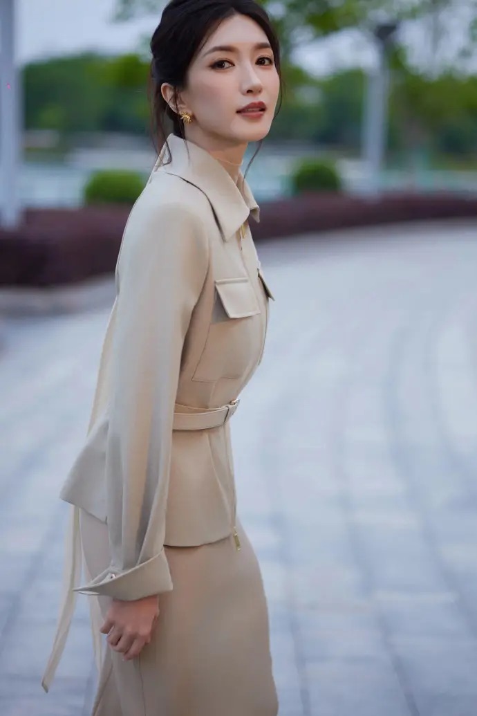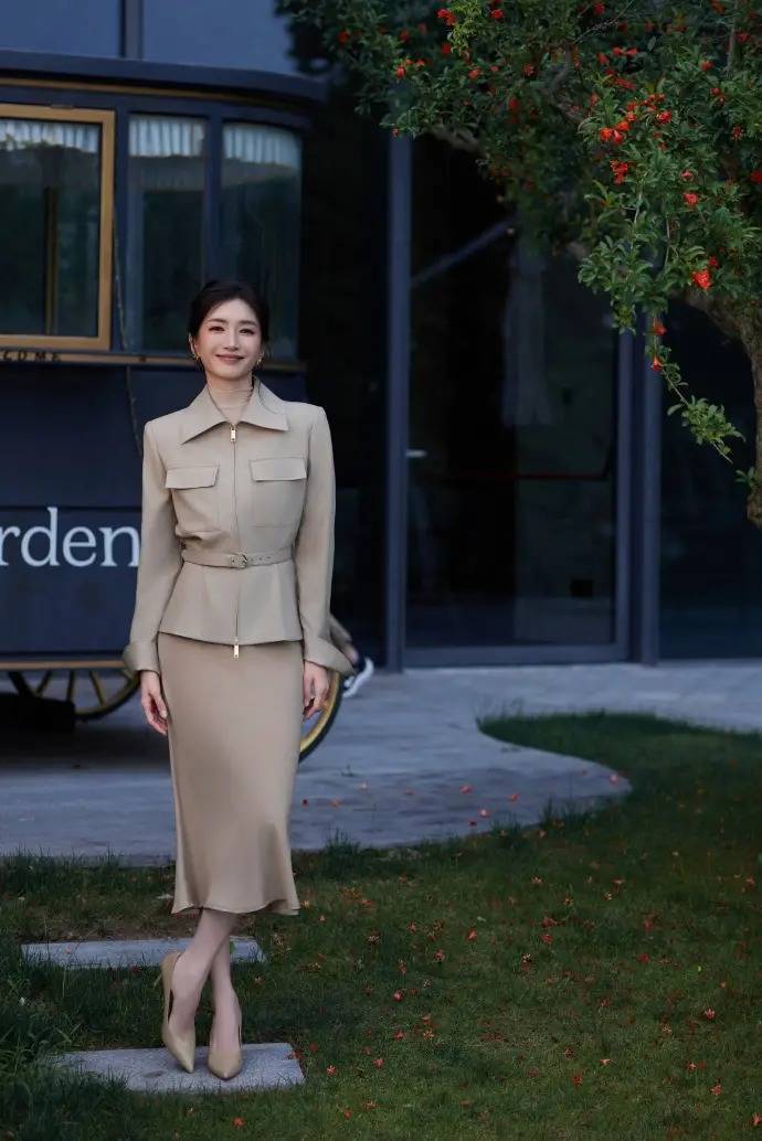 这款卡其色的干事套装的穿搭,这款穿搭展现了她的优雅与干练,完好意思诠释了高档感和干事风仪,值得很多职场女性模仿。