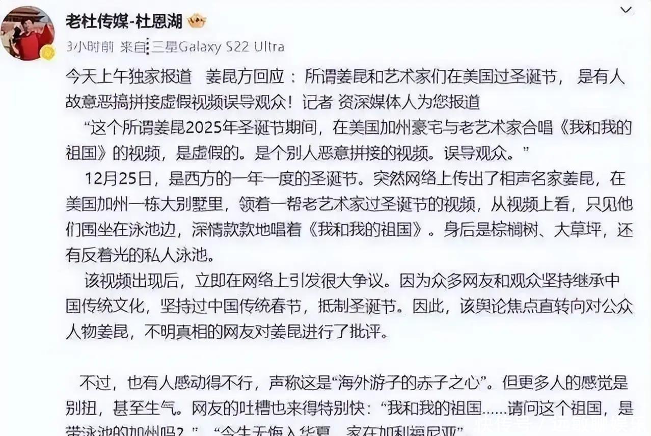 视频最早在应对平台上被转成竖屏版块,发轫三秒只剩下姜昆和泳池水面,字幕却写着“圣诞夜在加州”,好多东谈主就这么被预设场景拽进去了,最先扩散的几个账号同期把时辰标成12月25日,播放量在一天内攀到几十万,后续指摘里“蓝本他东谈主在好意思国”的说法,就顺着这条时辰错位的线快速堆起来。