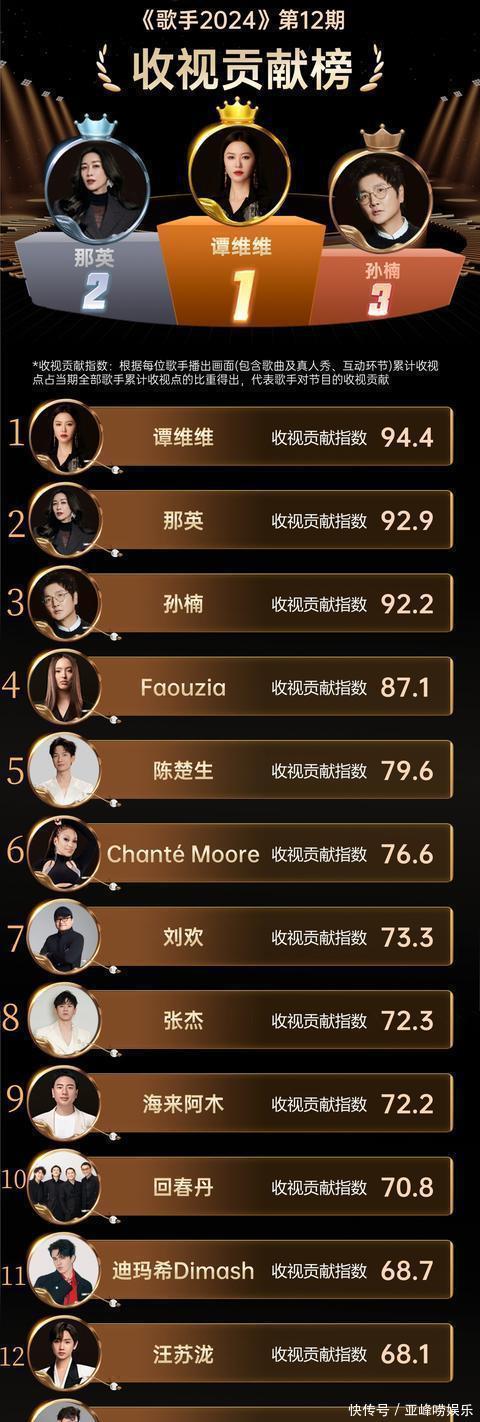 亚军则是自后的“歌王”那英,92.9的收视孝敬指数,和谭维维咬得很紧,诠释天后不愧是天后,永远有一批死忠歌迷奴婢,能扛收视,战绩特殊能打。