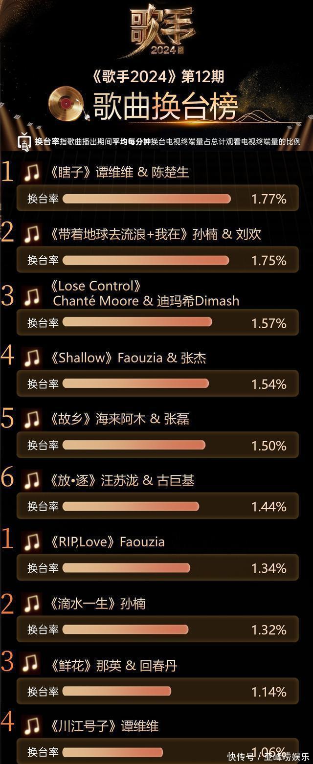 排在第三名的,则是香缇莫和迪玛希,两位“叫子精合体”带来的《Lose Control》,1.57%的换台率,和前边两组大佬存在一定的差距。