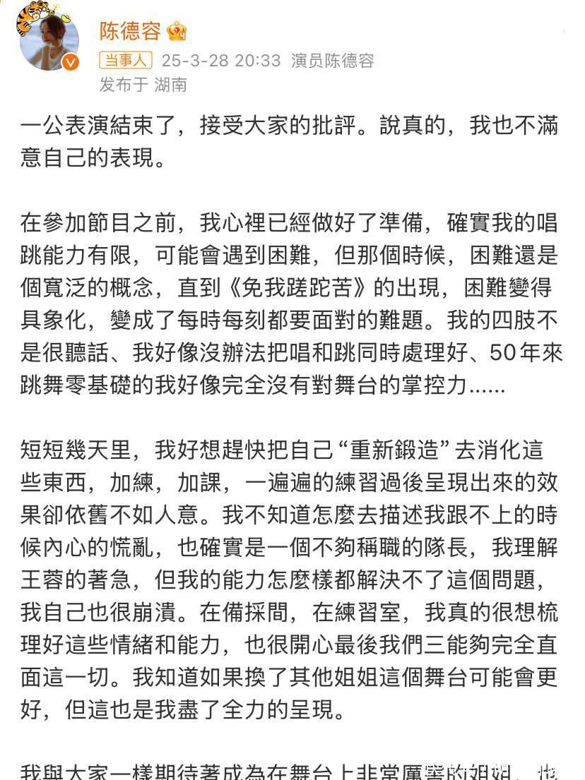 3月28日晚间,陈德容通过莽撞平台发长文讲述近期争议,她示意采纳群众的月旦,且对我方的饰演也不闲散。