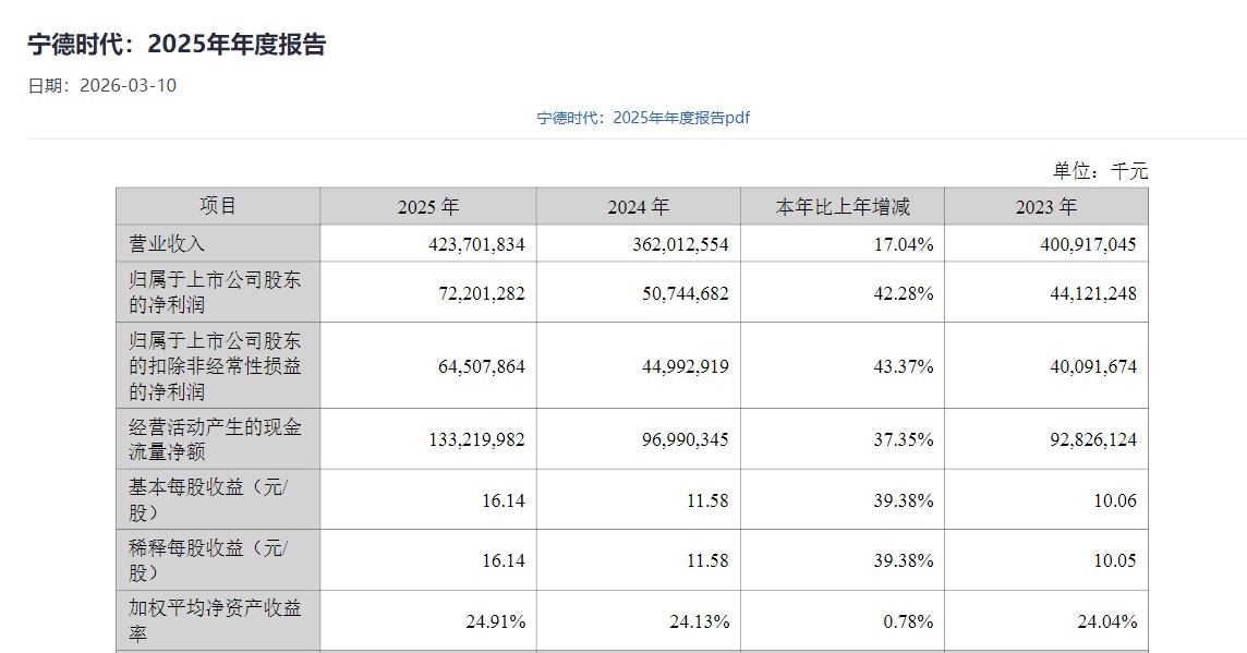 年报暴露,宁德期间2025年收场营业收入4237.02亿元,同比增长17.04%;收场归母净利润722.01亿元,同比增长42.28%,收场基本每股收益16.14元。陈诉期内,公司收场锂离子电板销量661GWh,同比增长39.16%。