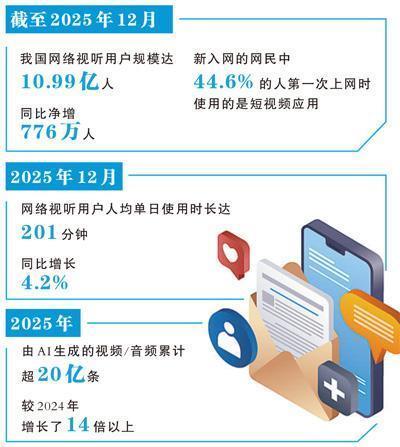 本报成皆4月15日电 (记者王明峰、徐嘉伟)15日,在第十三届中国汇聚视听大会上,中国汇聚视听节目工作协会发布《中国汇聚视听发展参议请问(2026)》。请问深刻:放肆2025年12月,我国汇聚视听用户鸿沟达10.99亿东谈主,同比净增776万东谈主,多年稳居互联网利用首位。